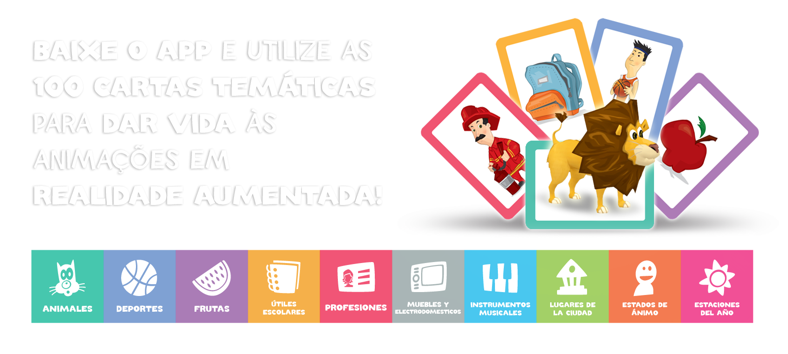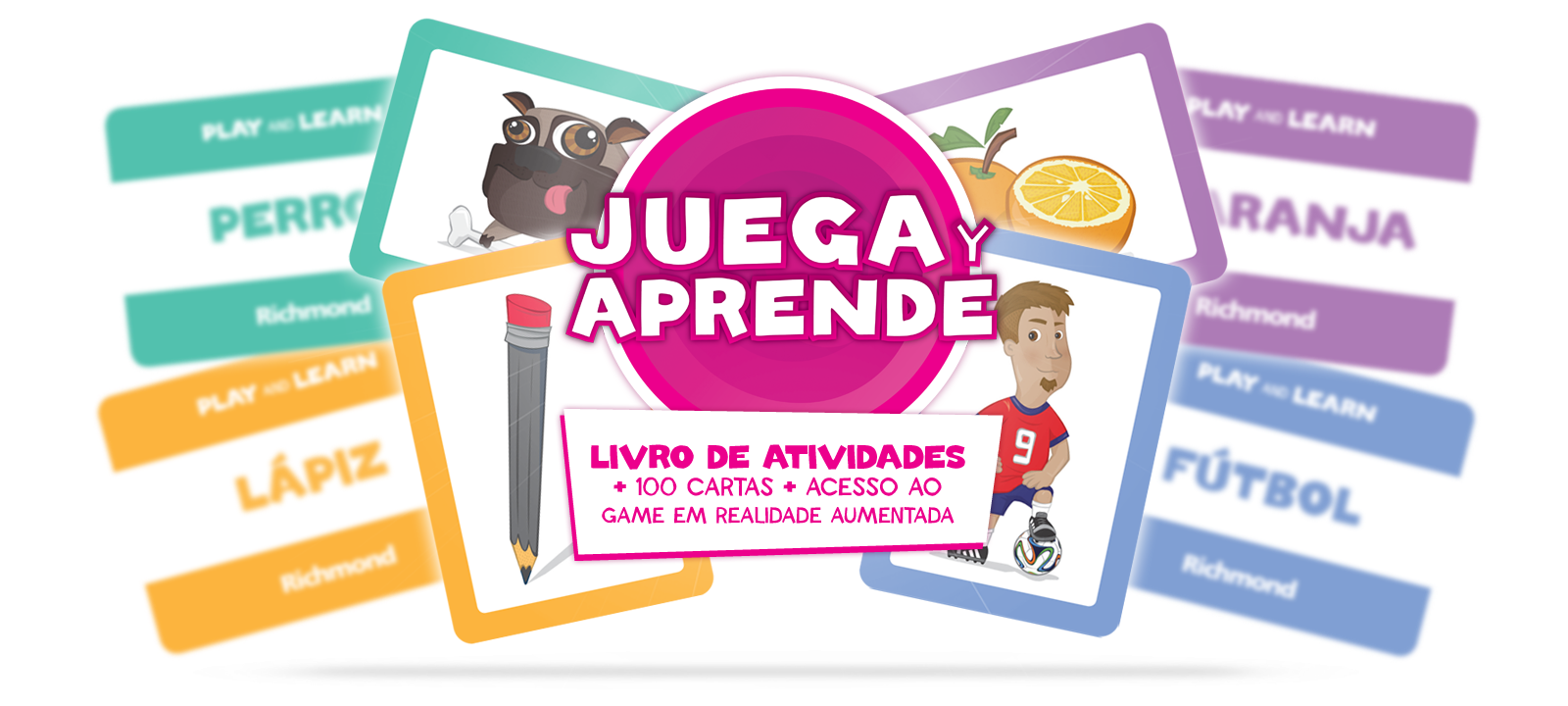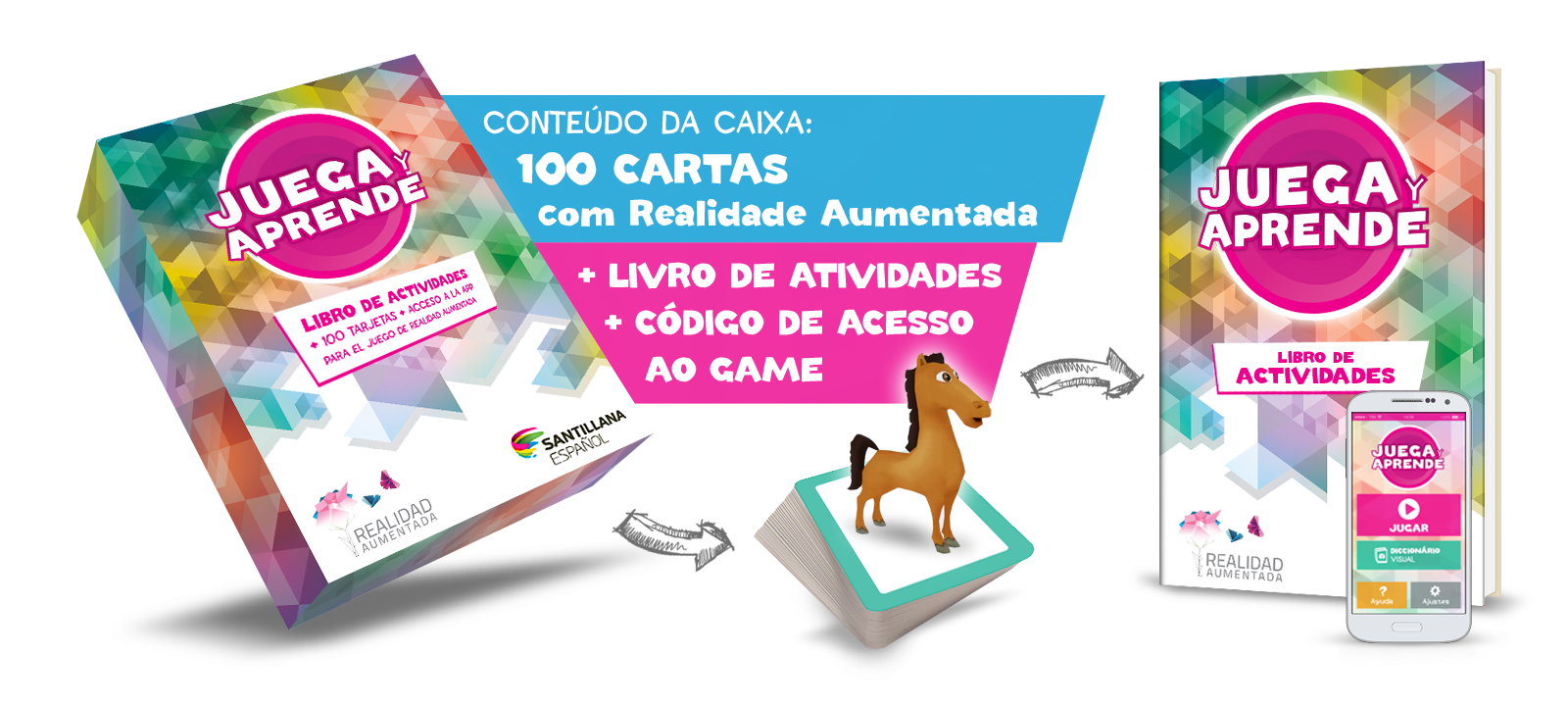 Juega y Aprende é um material composto de 1 Livro de Atividades + 100 cartas ilustradas divididas em 10 categorias temáticas + 1 código de acesso (impresso no Livro de Atividades) que libera o acesso ao aplicativo do jogo.